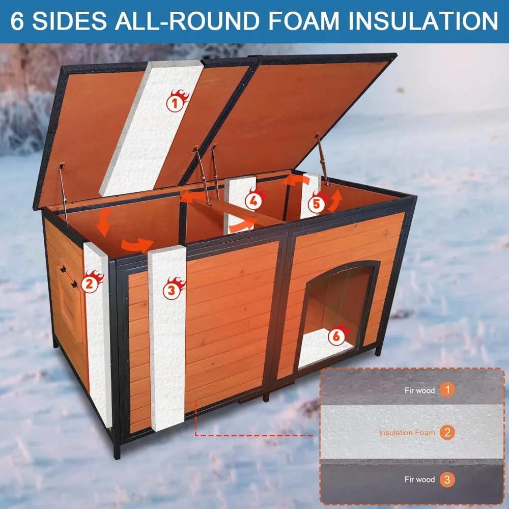 - All-Weather Dog House: All 6 sides of this insulated dog house outdoor are built like a tank! A durable iron frame surrounds a solid sandwich of fir wood, styrofoam, and plywood—no separate liners. The foam is permanently sealed within, creating a cozy and warm XL dog house for your pet